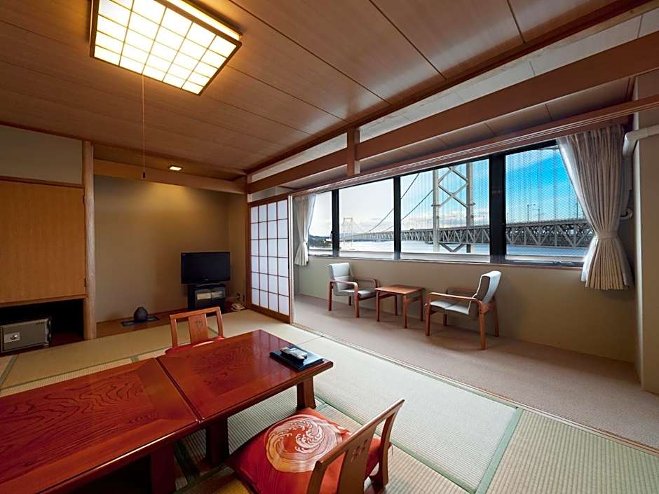 Room featuring ocean views and a tatami (woven-straw) floor, on which traditional futon bedding is spread to sleep in. It’s fitted with an LCD TV, a small fridge and yukata robes. All rooms have an attached bathroom.